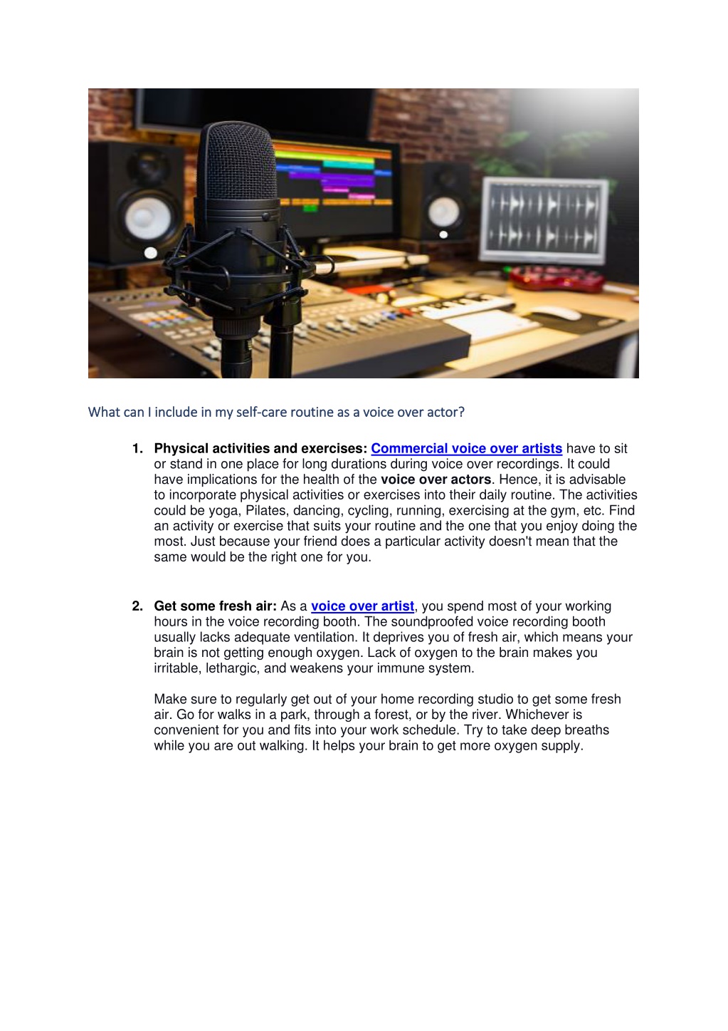 What can I include in my self What can I include in my self- -care routine as a voice over actor? care routine as a voice over actor? 1. Physical activities and exercises: Commercial voice over artists have to sit or stand in one place for long durations during voice over recordings. It could have implications for the health of the voice over actors. Hence, it is advisable to incorporate physical activities or exercises into their daily routine. The activities could be yoga, Pilates, dancing, cycling, running, exercising at the gym, etc. Find an activity or exercise that suits your routine and the one that you enjoy doing the most. Just because your friend does a particular activity doesn't mean that the same would be the right one for you. 2. Get some fresh air: As a voice over artist, you spend most of your working hours in the voice recording booth. The soundproofed voice recording booth usually lacks adequate ventilation. It deprives you of fresh air, which means your brain is not getting enough oxygen. Lack of oxygen to the brain makes you irritable, lethargic, and weakens your immune system. Make sure to regularly get out of your home recording studio to get some fresh air. Go for walks in a park, through a forest, or by the river. Whichever is convenient for you and fits into your work schedule. Try to take deep breaths while you are out walking. It helps your brain to get more oxygen supply.