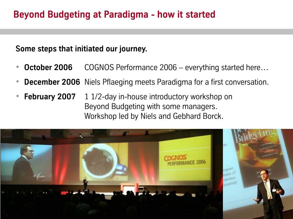 Beyond Budgeting at Paradigma - how it started Some steps that initiated our journey. • October 2006 COGNOS Performance 2006 – everything started here… • December 2006 Niels Pflaeging meets Paradigma for a first conversation. • February 2007 1 1/2-day in-house introductory workshop on Beyond Budgeting with some managers. Workshop led by Niels and Gebhard Borck.