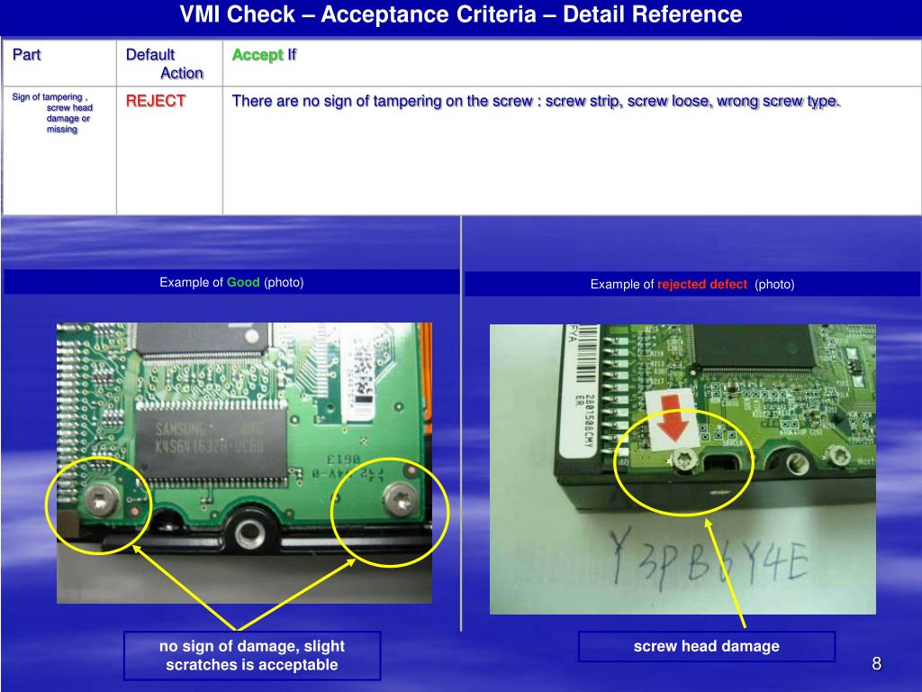 VMI Check – Acceptance Criteria – Detail Reference Example of Good (photo) Example of rejected defect (photo) no sign of damage, slight scratches is acceptable screw head damage