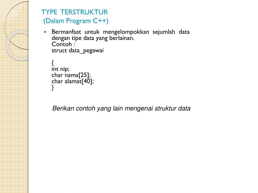 TYPE TERSTRUKTUR (Dalam Program C++) • Bermanfaat untuk mengelompokkan sejumlah data dengan tipe data yang berlainan.Contoh :struct data_pegawai{int nip;char nama[25];char alamat[40];} Berikan contoh yang lain mengenai struktur data