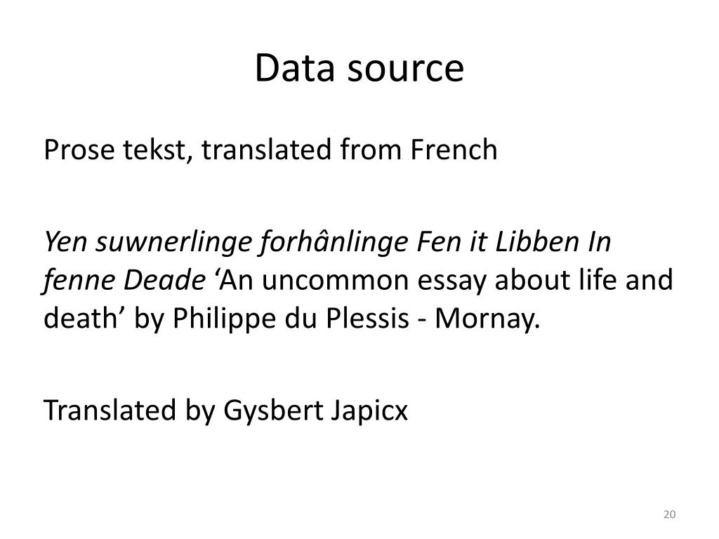 Data source Prose tekst, translatedfrom French Yen suwnerlinge forhânlinge Fen it Libben In fenne Deade ‘An uncommon essay about life and death’ by Philippe du Plessis - Mornay. TranslatedbyGysbertJapicx