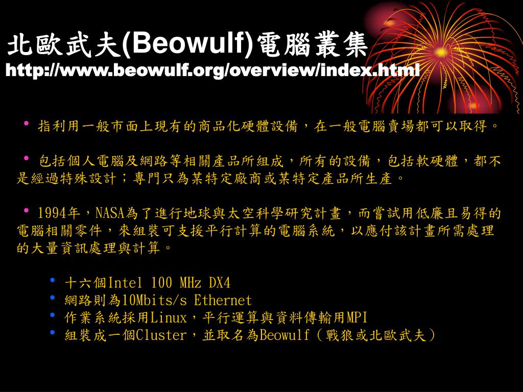 北歐武夫(Beowulf)電腦叢集http://www.beowulf.org/overview/index.html北歐武夫(Beowulf)電腦叢集http://www.beowulf.org/overview/index.html • 指利用一般市面上現有的商品化硬體設備,在一般電腦賣場都可以取得。 • 包括個人電腦及網路等相關產品所組成,所有的設備,包括軟硬體,都不是經過特殊設計;專門只為某特定廠商或某特定產品所生產。 • 1994年,NASA為了進行地球與太空科學研究計畫,而嘗試用低廉且易得的電腦相關零件,來組裝可支援平行計算的電腦系統,以應付該計畫所需處理的大量資訊處理與計算。 • 十六個Intel 100 MHz DX4 • 網路則為10Mbits/s Ethernet • 作業系統採用Linux,平行運算與資料傳輸用MPI • 組裝成一個Cluster,並取名為Beowulf(戰狼或北歐武夫)