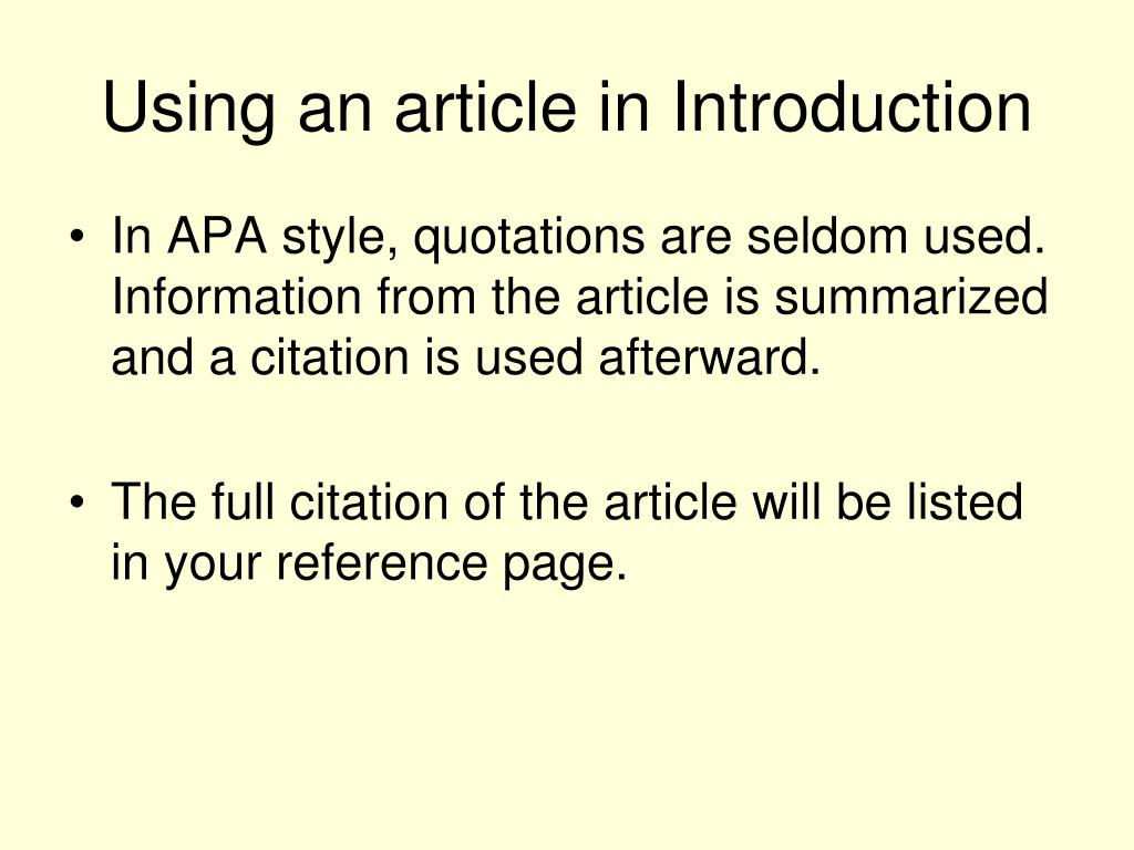 Using an article in Introduction • In APA style, quotations are seldom used. Information from the article is summarized and a citation is used afterward. • The full citation of the article will be listed in your reference page.