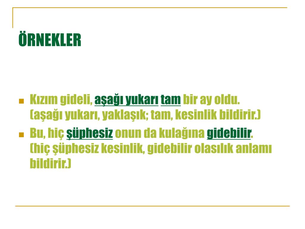 ÖRNEKLER • Kızım gideli,aşağı yukarıtambir ay oldu. (aşağı yukarı, yaklaşık; tam, kesinlik bildirir.) • Bu, hiç şüphesiz onun da kulağına gidebilir. (hiç şüphesiz kesinlik, gidebilir olasılık anlamı bildirir.)
