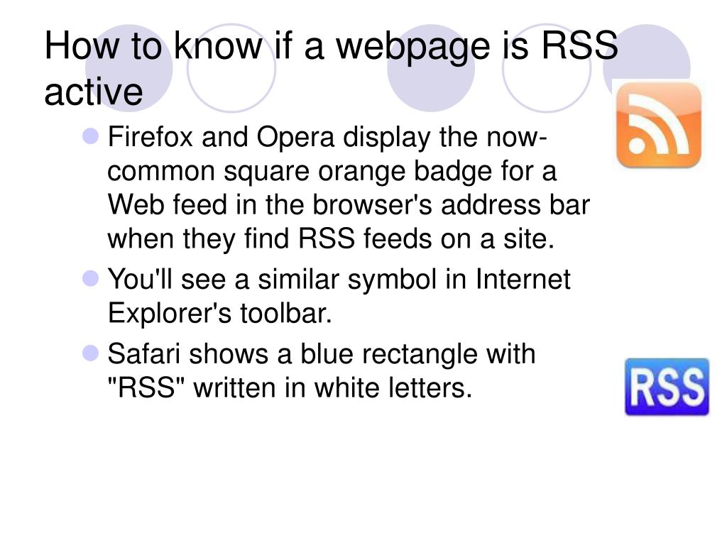 How to know if a webpage is RSS active • Firefox and Opera display the now-common square orange badge for a Web feed in the browser's address bar when they find RSS feeds on a site. • You'll see a similar symbol in Internet Explorer's toolbar. • Safari shows a blue rectangle with "RSS" written in white letters.