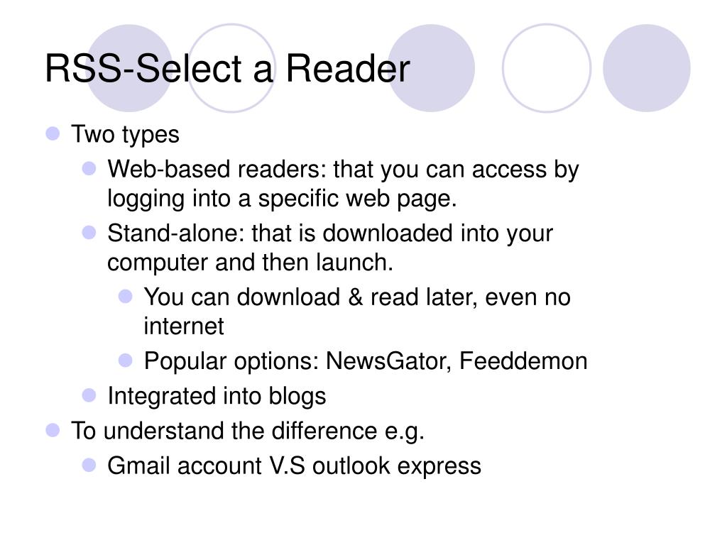 RSS-Select a Reader • Two types • Web-based readers: that you can access by logging into a specific web page. • Stand-alone: that is downloaded into your computer and then launch. • You can download & read later, even no internet • Popular options: NewsGator, Feeddemon • Integrated into blogs • To understand the difference e.g. • Gmail account V.S outlook express