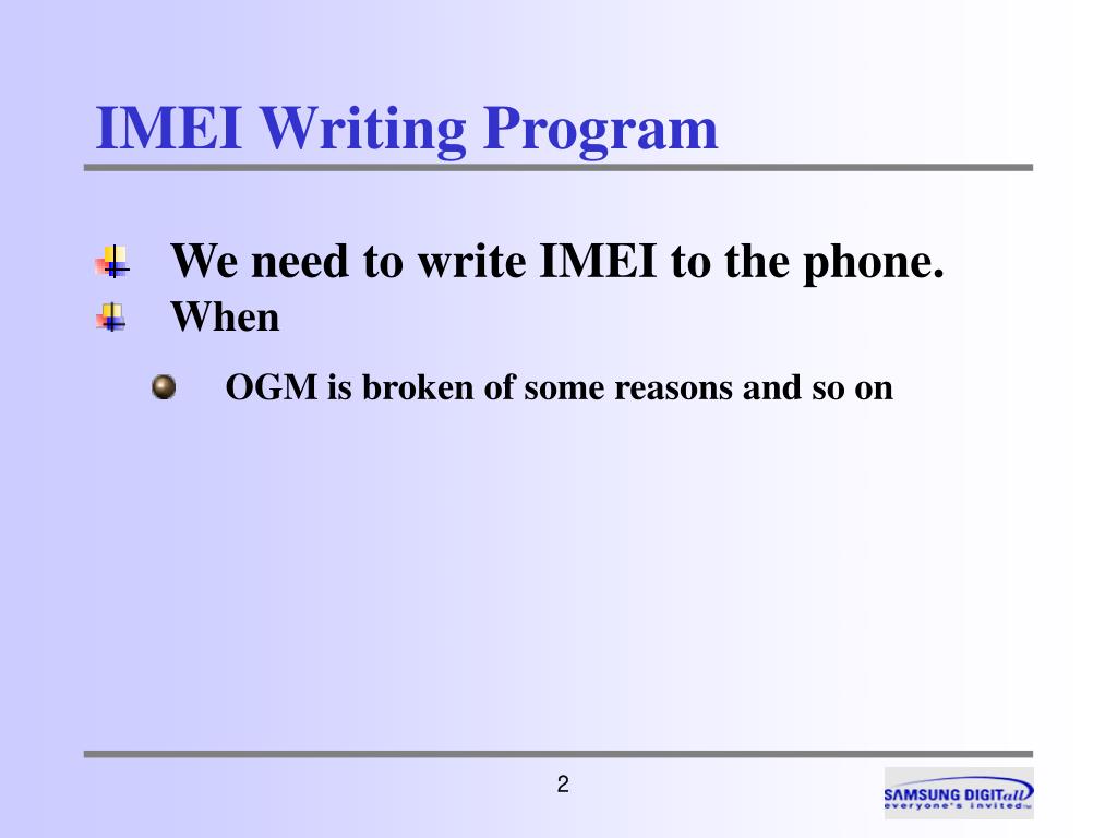 3. IMEI Program. SGH-A800. IMEI Writing Program. We need to write IMEI to the phone . When OGM is broken of some reasons and so on. Equipments for IMEI Program. PC JIG Converter RS232 cable 9 pin RS232 cable (connect PC with JIG)
