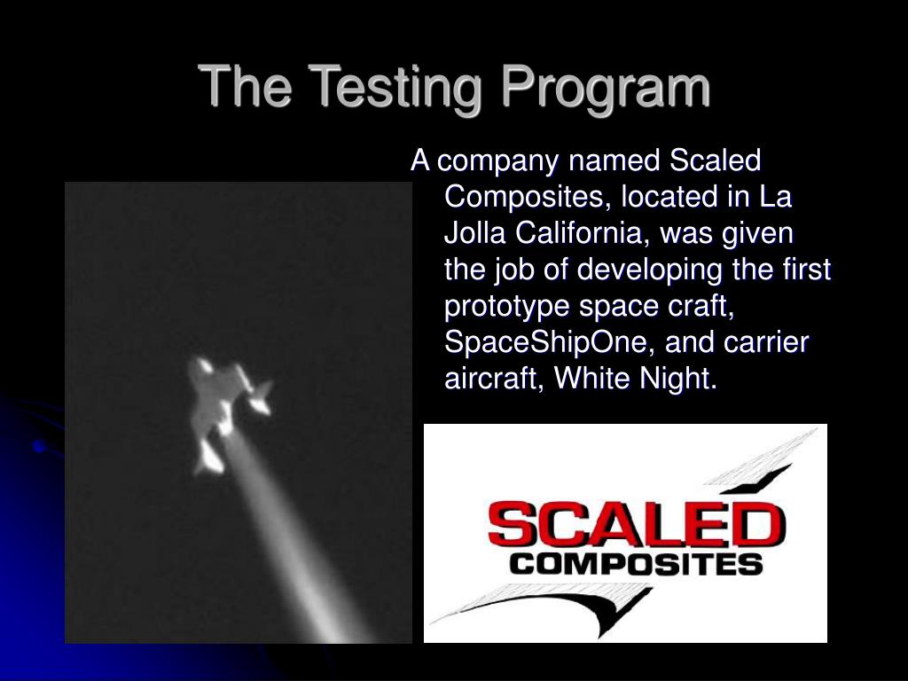 The Testing Program A company named Scaled Composites, located in La Jolla California, was given the job of developing the first prototype space craft, SpaceShipOne, and carrier aircraft, White Night.