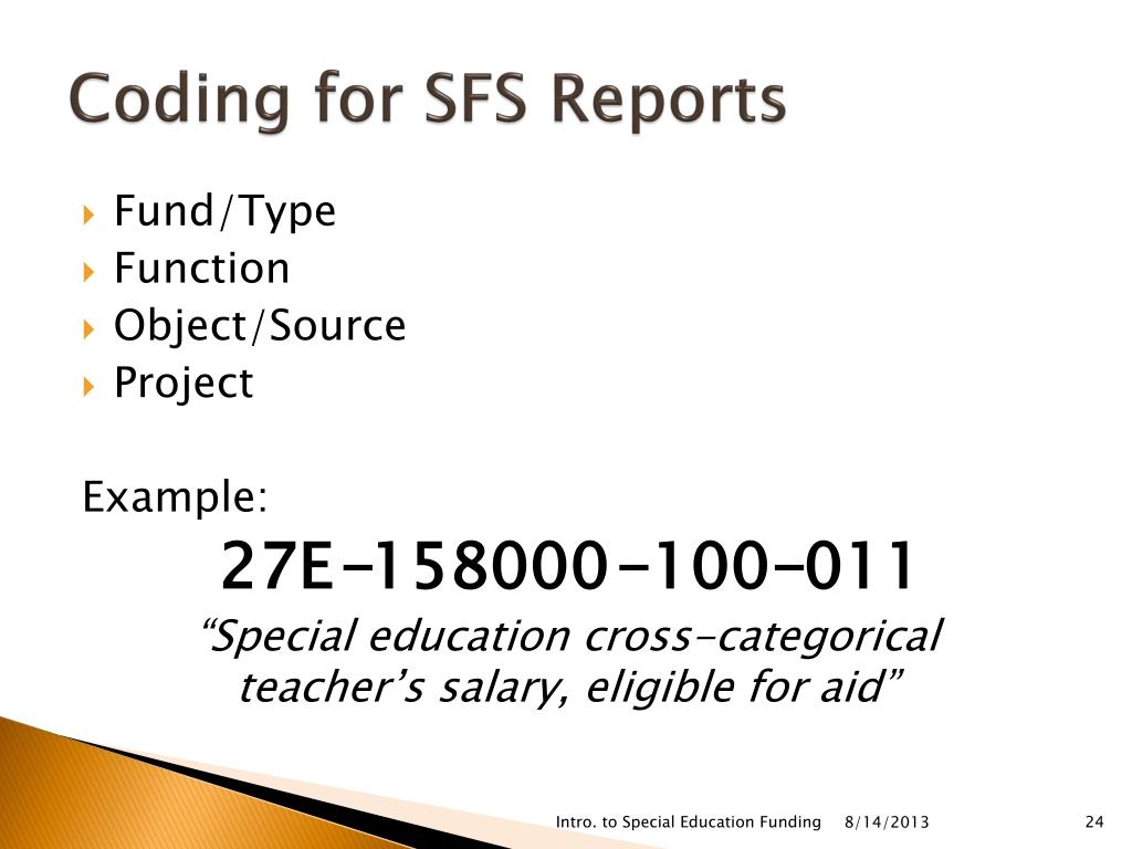 Coding for SFS Reports • Fund/Type • Function • Object/Source • Project Example: - - - “Special education cross-categoricalteacher’s salary, eligible for aid” 27E 158000 100 011 Intro. to Special Education Funding