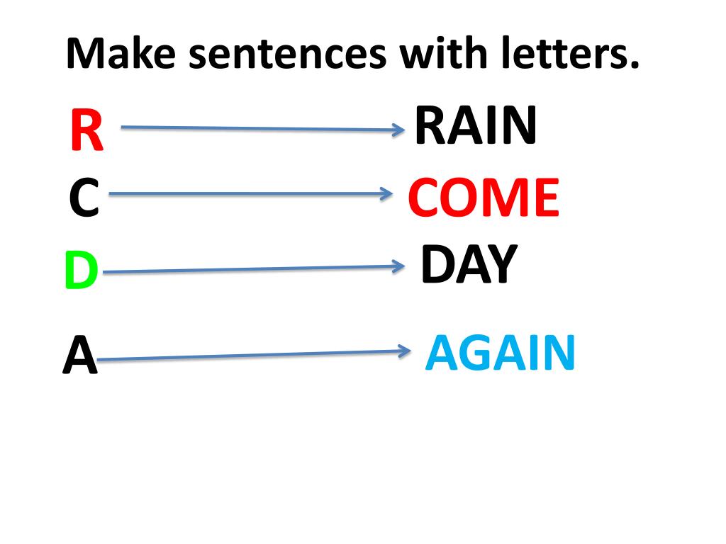 rAIN C COME Make sentences with letters. DAY D A AGAIN R
