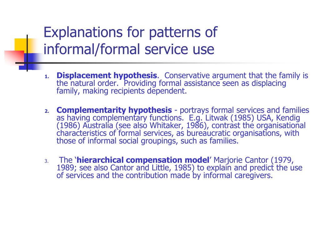 Explanations for patterns of informal/formal service use • Displacement hypothesis. Conservative argument that the family is the natural order. Providing formal assistance seen as displacing family, making recipients dependent. • Complementarity hypothesis - portrays formal services and families as having complementary functions. E.g. Litwak (1985) USA, Kendig (1986) Australia (see also Whitaker, 1986), contrast the organisational characteristics of formal services, as bureaucratic organisations, with those of informal social groupings, such as families. • The ‘hierarchical compensation model’ Marjorie Cantor (1979, 1989; see also Cantor and Little, 1985) to explain and predict the use of services and the contribution made by informal caregivers.