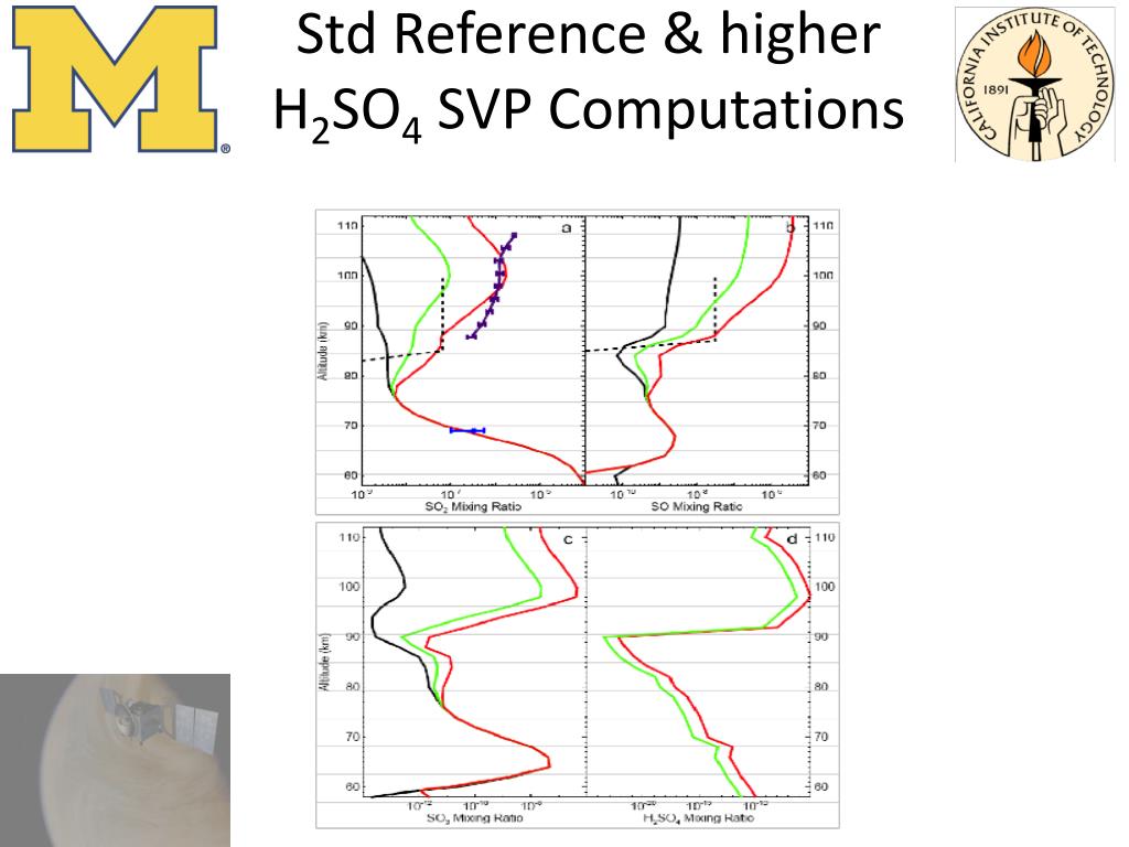 Parameter space for possible solutions Blue shaded area shows parameter space where model predicts SO2 mixing ratios between 0.01 and 1 ppm at 100 km Golden line = max values of SO2 (67 ppb) from microwave measurements of Sandor et al (2010)