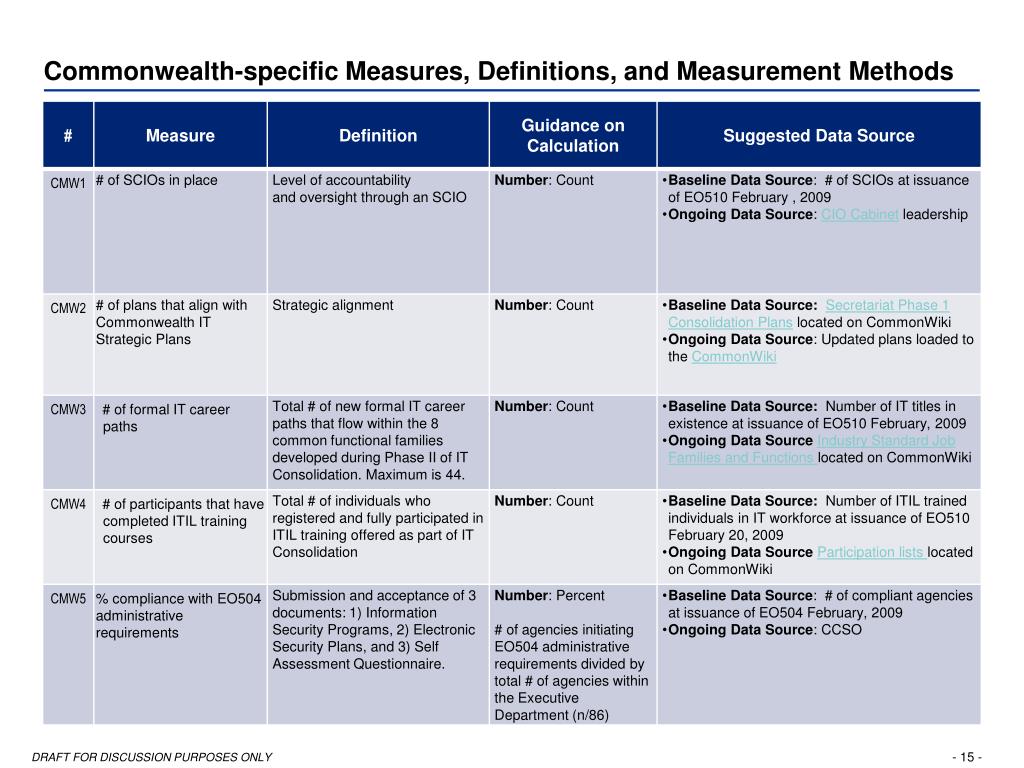 Measures, Definitions, and Measurement Methods (cont.) ** The 6 ITIL processes being targeted for implementation across the Commonwealth are: incident, change, problem, asset, capacity, and service level management