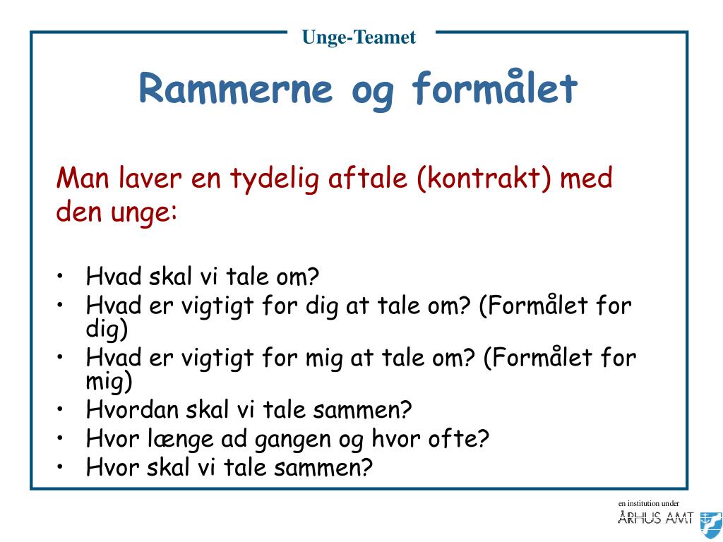 Unge-Teamet • Rammerne og formålet • Man laver en tydelig aftale (kontrakt) med • den unge: • Hvad skal vi tale om? • Hvad er vigtigt for dig at tale om? (Formålet for dig) • Hvad er vigtigt for mig at tale om? (Formålet for mig) • Hvordan skal vi tale sammen? • Hvor længe ad gangen og hvor ofte? • Hvor skal vi tale sammen?