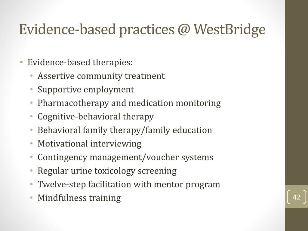 Evidence-based practices @ WestBridge • Evidence-based therapies: • Assertive community treatment • Supportive employment • Pharmacotherapy and medication monitoring • Cognitive-behavioral therapy • Behavioral family therapy/family education • Motivational interviewing • Contingency management/voucher systems • Regular urine toxicology screening • Twelve-step facilitation with mentor program • Mindfulness training
