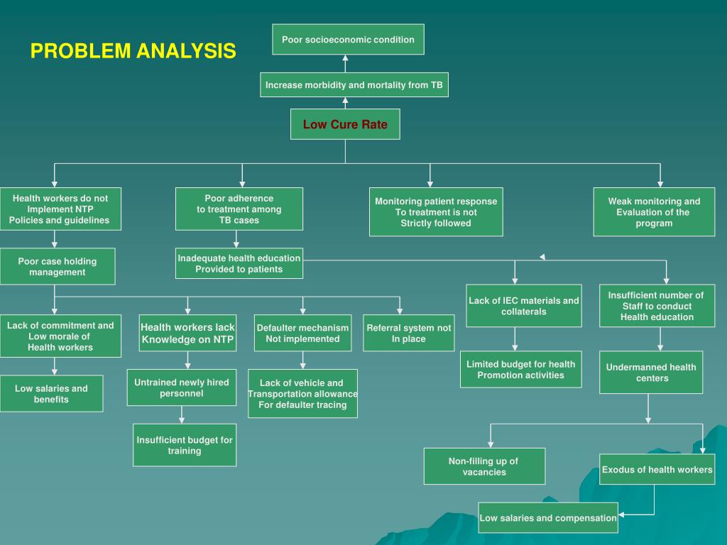 PROBLEM ANALYSIS Poor socioeconomic condition Increase morbidity and mortality from TB Low Cure Rate Health workers do not Implement NTP Policies and guidelines Poor adherence to treatment among TB cases Monitoring patient response To treatment is not Strictly followed Weak monitoring and Evaluation of the program Poor case holding management Inadequate health education Provided to patients Lack of IEC materials and collaterals Insufficient number of Staff to conduct Health education Lack of commitment and Low morale of Health workers Health workers lack Knowledge on NTP Defaulter mechanism Not implemented Referral system not In place Limited budget for health Promotion activities Undermanned health centers Untrained newly hired personnel Lack of vehicle and Transportation allowance For defaulter tracing Low salaries and benefits Insufficient budget for training Non-filling up of vacancies Exodus of health workers Low salaries and compensation