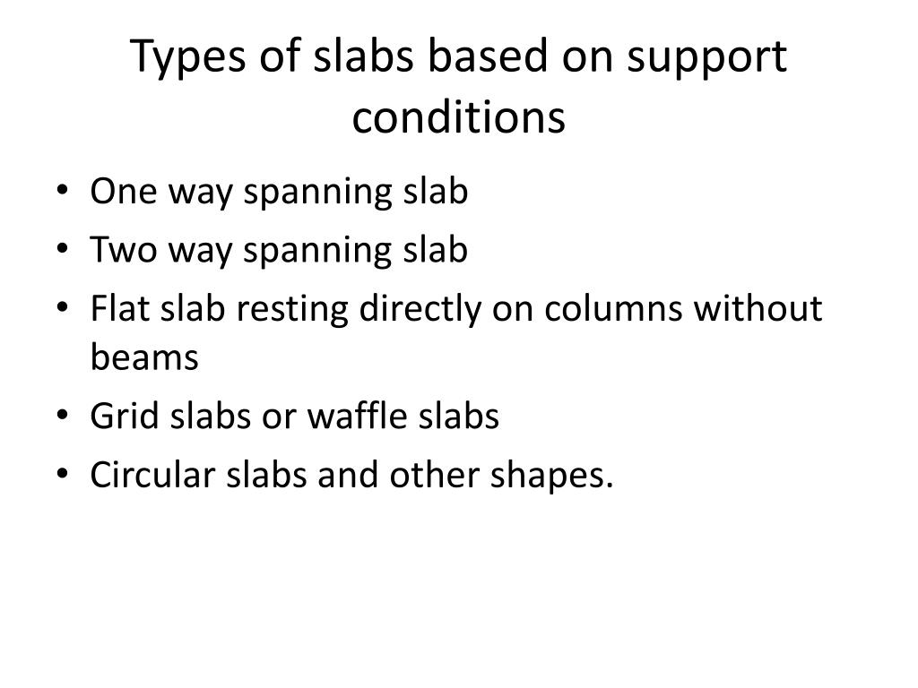 Types of slabs based on support conditions • One way spanning slab • Two way spanning slab • Flat slab resting directly on columns without beams • Grid slabs or waffle slabs • Circular slabs and other shapes.