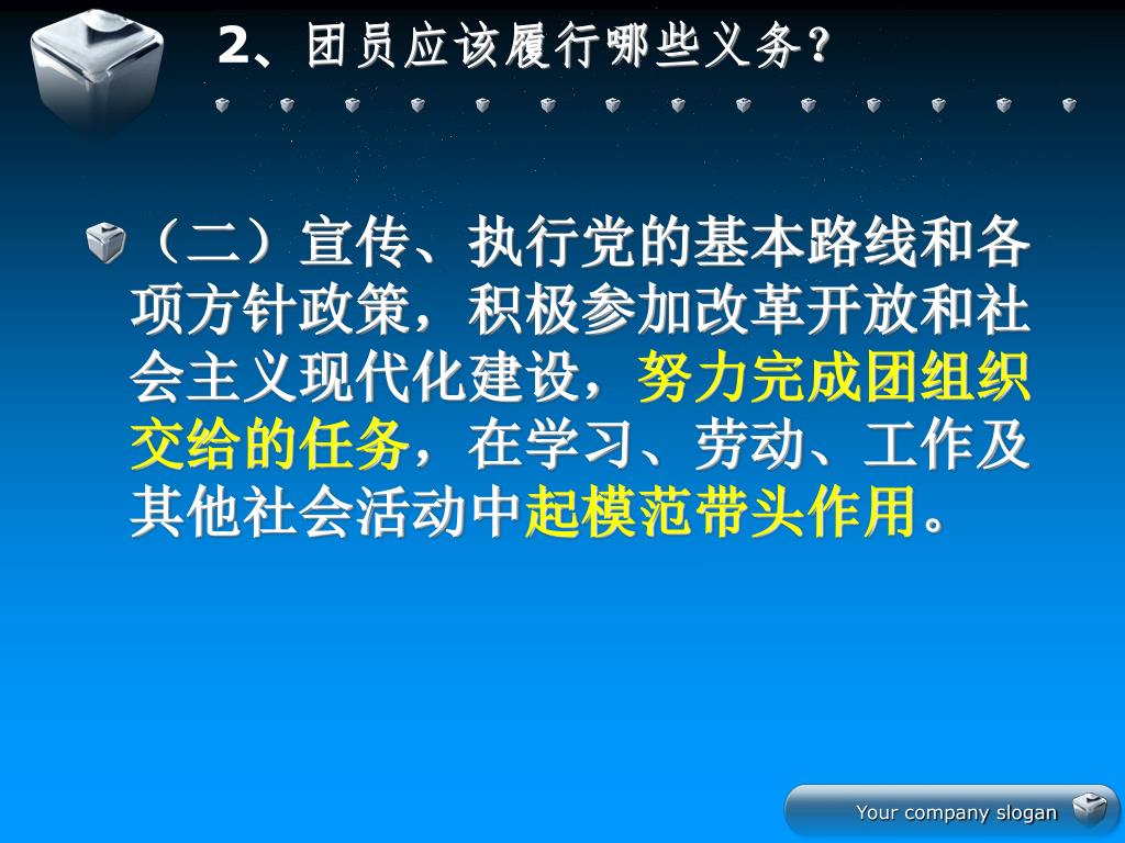 2、团员应该履行哪些义务? • (二)宣传、执行党的基本路线和各项方针政策,积极参加改革开放和社会主义现代化建设,努力完成团组织交给的任务,在学习、劳动、工作及其他社会活动中起模范带头作用。