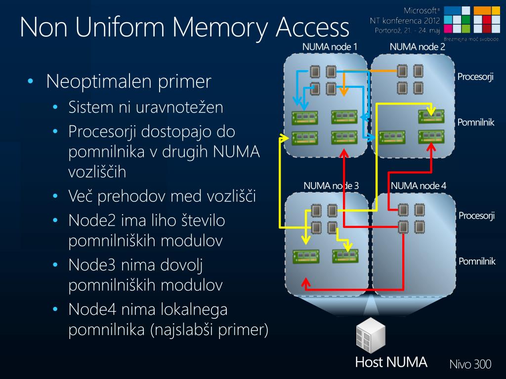 Non Uniform Memory Access NUMA node 1 NUMA node 2 Procesorji • Optimalen primer • Sistem je uravnotežen • Procesorji dostopajo le do pomnilnika v istem NUMA vozlišču • Vsako vozlišče ima svoj pomnilnik Pomnilnik NUMA node 3 NUMA node 4 Procesorji Pomnilnik Host NUMA