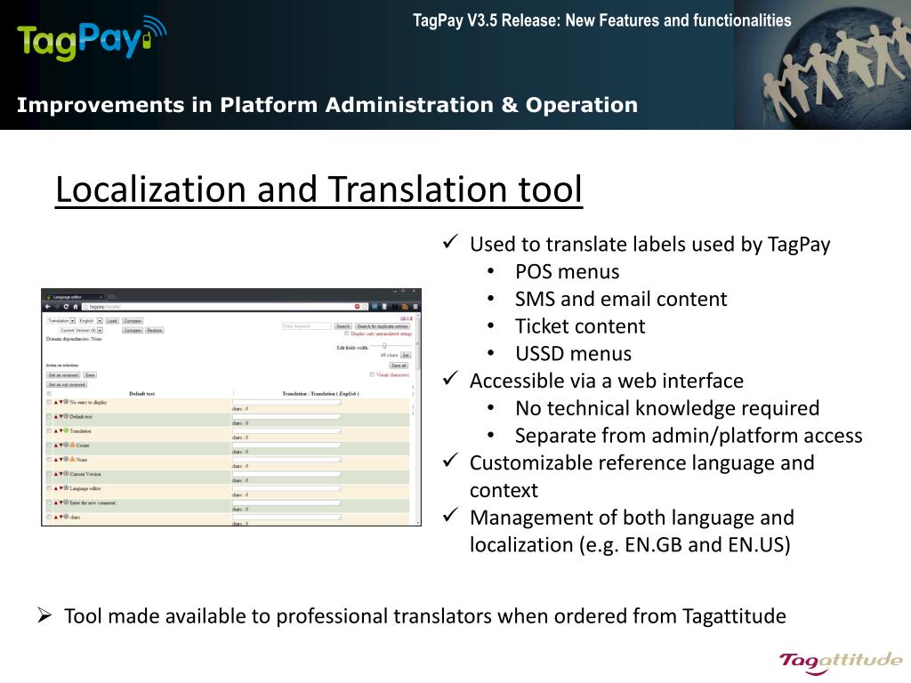 Improvements in Platform Administration & Operation Localization and Translation tool • Used to translate labels used by TagPay • POS menus • SMS and email content • Ticket content • USSD menus • Accessible via a web interface • No technical knowledge required • Separate from admin/platform access • Customizable reference language and context • Management of both language and localization (e.g. EN.GB and EN.US) • Tool made available to professional translators when ordered from Tagattitude