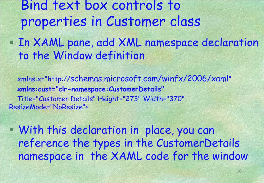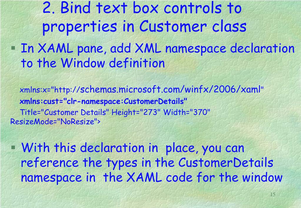 Bind text box controls to properties in Customer class • In XAML pane, add XML namespace declaration to the Window definition xmlns:x="http://schemas.microsoft.com/winfx/2006/xaml" xmlns:cust="clr-namespace:CustomerDetails" Title="Customer Details" Height="273" Width="370" ResizeMode="NoResize"> • With this declaration in place, you can reference the types in the CustomerDetails namespace in the XAML code for the window