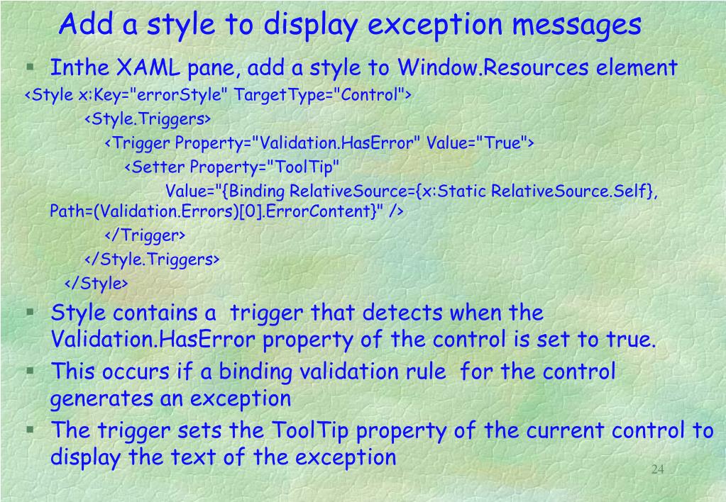 Add a style to display exception messages • Inthe XAML pane, add a style to Window.Resources element <Style x:Key="errorStyle" TargetType="Control"> <Style.Triggers> <Trigger Property="Validation.HasError" Value="True"> <Setter Property="ToolTip" Value="{Binding RelativeSource={x:Static RelativeSource.Self}, Path=(Validation.Errors)[0].ErrorContent}" /> </Trigger> </Style.Triggers> </Style> • Style contains a trigger that detects when the Validation.HasError property of the control is set to true. • This occurs if a binding validation rule for the control generates an exception • The trigger sets the ToolTip property of the current control to display the text of the exception