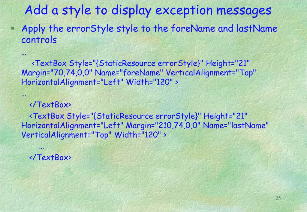 Add a style to display exception messages • Apply the errorStyle style to the foreName and lastName controls … <TextBox Style="{StaticResource errorStyle}" Height="21" Margin="70,74,0,0" Name="foreName" VerticalAlignment="Top" HorizontalAlignment="Left" Width="120" > … </TextBox> <TextBox Style="{StaticResource errorStyle}" Height="21" HorizontalAlignment="Left" Margin="210,74,0,0" Name="lastName" VerticalAlignment="Top" Width="120" > … </TextBox>