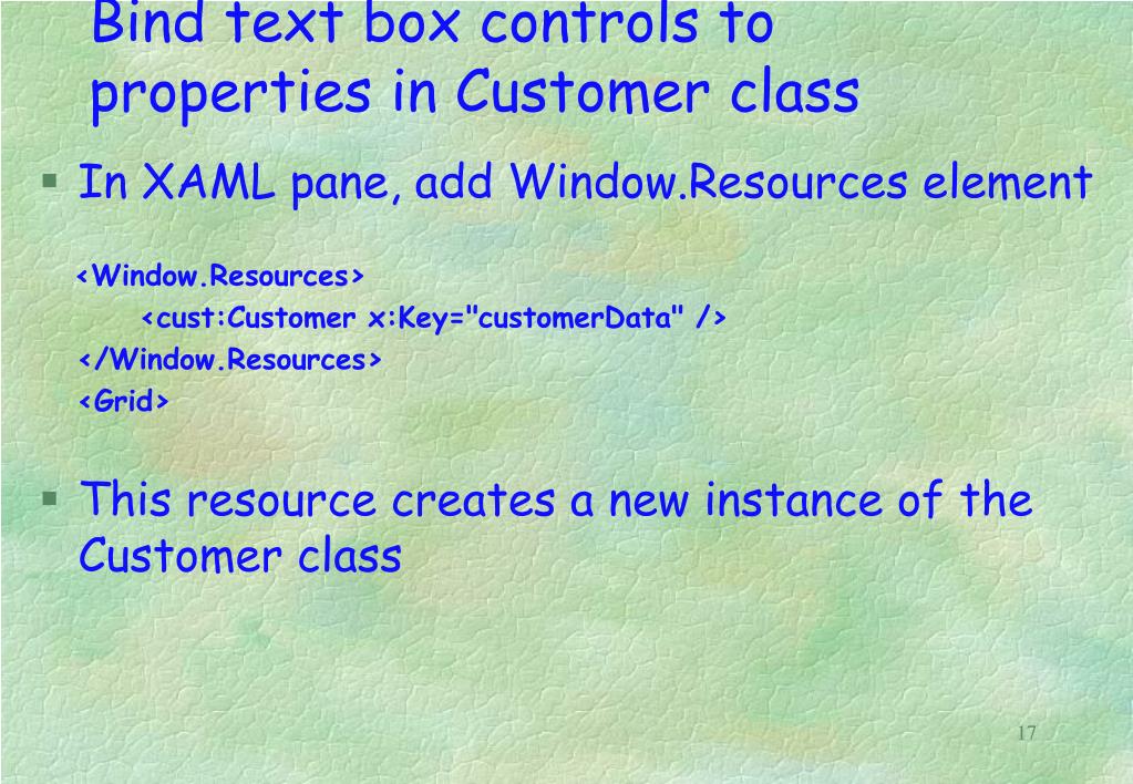 Bind text box controls to properties in Customer class • In XAML pane, add Window.Resources element <Window.Resources> <cust:Customer x:Key="customerData" /> </Window.Resources> <Grid> • This resource creates a new instance of the Customer class