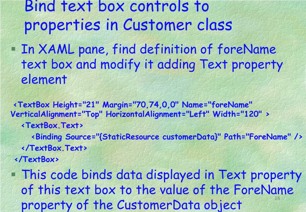 Bind text box controls to properties in Customer class • In XAML pane, find definition of foreName text box and modify it adding Text property element <TextBox Height="21" Margin="70,74,0,0" Name="foreName" VerticalAlignment="Top" HorizontalAlignment="Left" Width="120" > <TextBox.Text> <Binding Source="{StaticResourcecustomerData}" Path="ForeName" /> </TextBox.Text> </TextBox> • This code binds data displayed in Text property of this text box to the value of the ForeName property of the CustomerData object