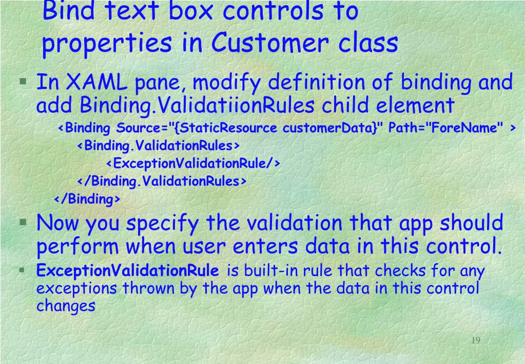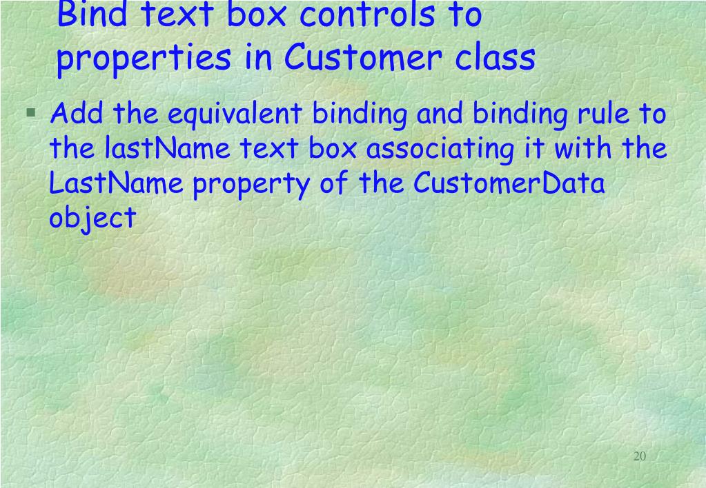Bind text box controls to properties in Customer class • Add the equivalent binding and binding rule to the lastName text box associating it with the LastName property of the CustomerData object