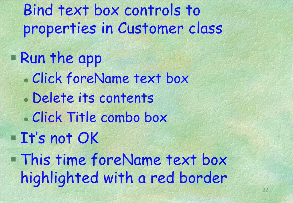 Bind text box controls to properties in Customer class Run the app Click foreName text box Delete its contents Click Title combo box It’s not OK This time foreName text box highlighted with a red border 22