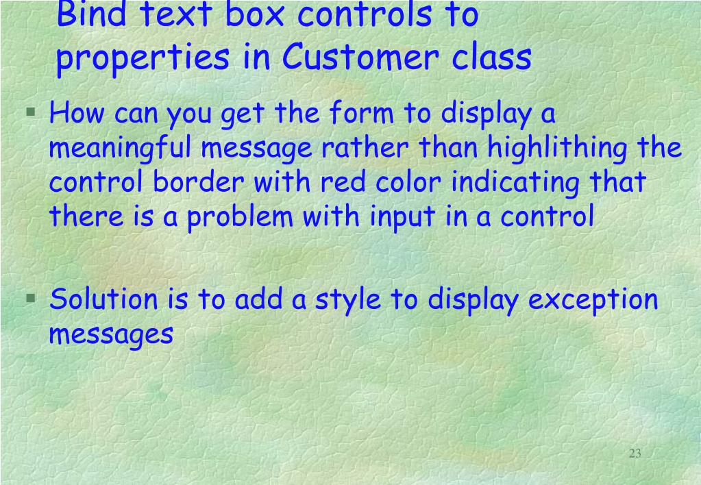 Bind text box controls to properties in Customer class • How can you get the form to display a meaningful message rather than highlithing the control border with red color indicating that there is a problem with input in a control • Solution is to add a style to display exception messages