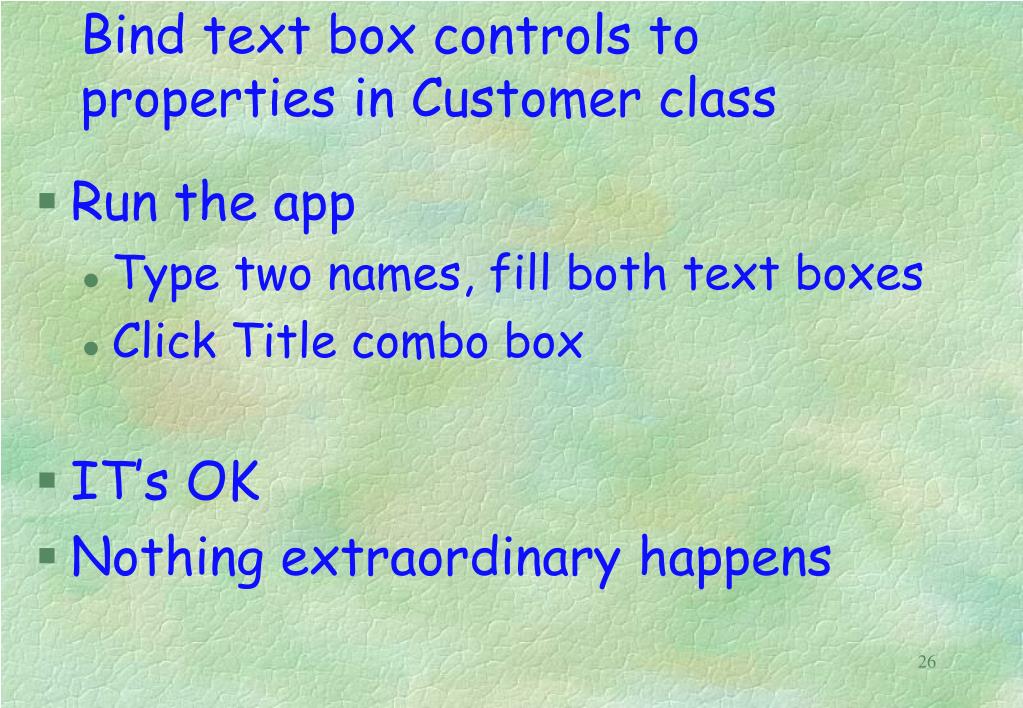 Bind text box controls to properties in Customer class • Run the app • Type two names, fill both text boxes • Click Title combo box • IT’s OK • Nothing extraordinary happens