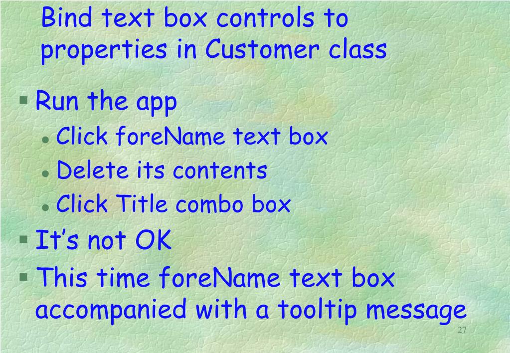 Bind text box controls to properties in Customer class Run the app Type two names, fill both text boxes Click Title combo box IT’s OK Nothing extraordinary happens 26