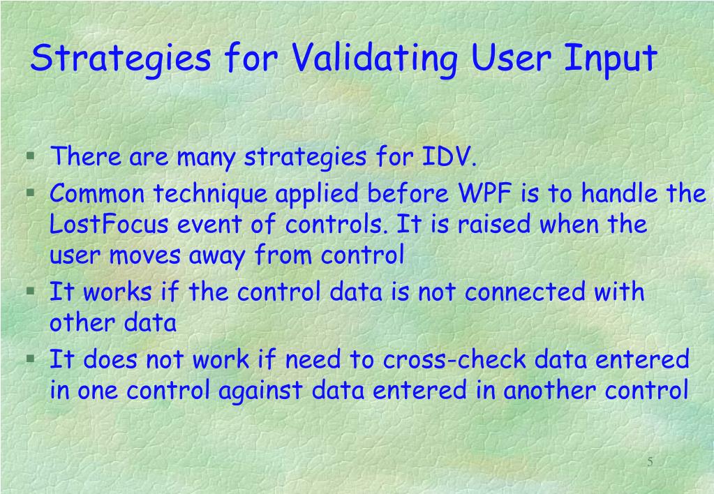 Strategies for Validating User Input • There are many strategies for IDV. • Common technique applied before WPF is to handle the LostFocus event of controls. It is raised when the user moves away from control • It works if the control data is not connected with other data • It does not work if need to cross-check data entered in one control against data entered in another control