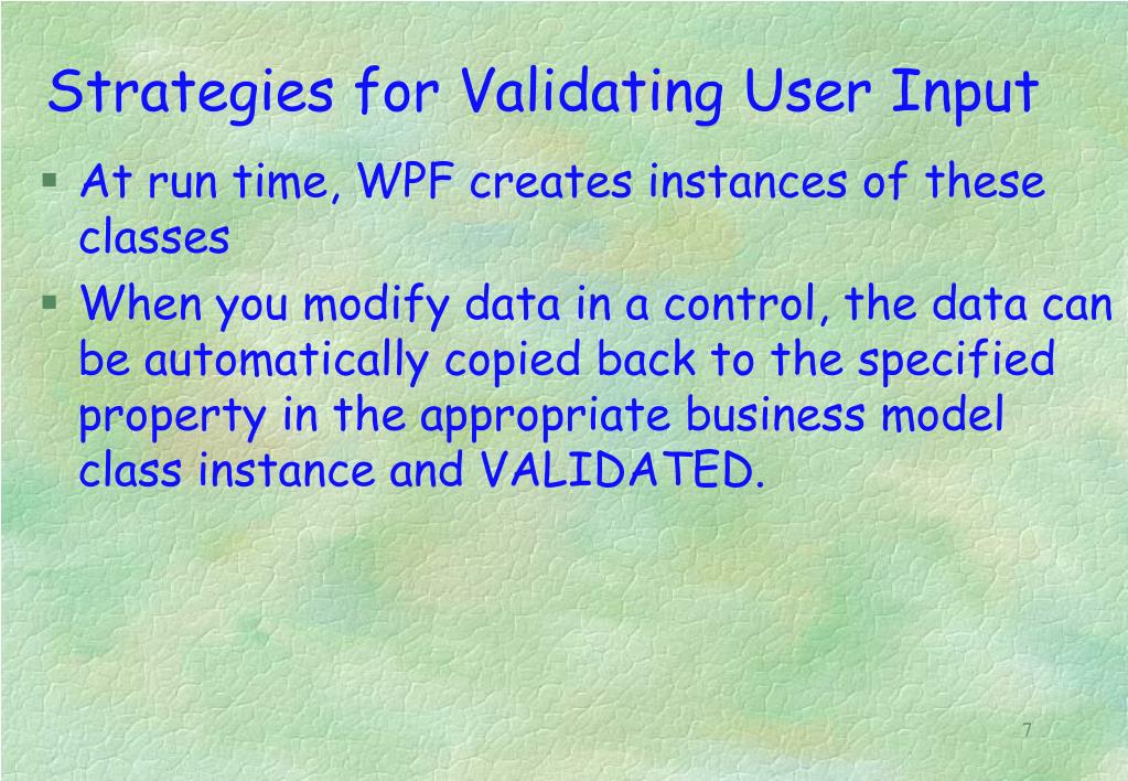 Strategies for Validating User Input At run time, WPF creates instances of these classes When you modify data in a control, the data can be automatically copied back to the specified property in the appropriate business model class instance and VALIDATED. 7