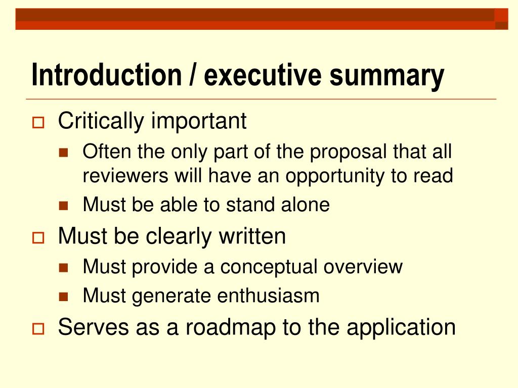 Introduction / executive summary • Critically important • Often the only part of the proposal that all reviewers will have an opportunity to read • Must be able to stand alone • Must be clearly written • Must provide a conceptual overview • Must generate enthusiasm • Serves as a roadmap to the application