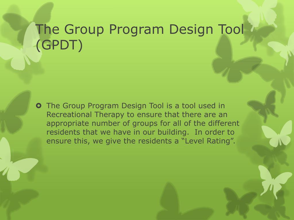 The Group Program Design Tool (GPDT) • The Group Program Design Tool is a tool used in Recreational Therapy to ensure that there are an appropriate number of groups for all of the different residents that we have in our building. In order to ensure this, we give the residents a “Level Rating”.