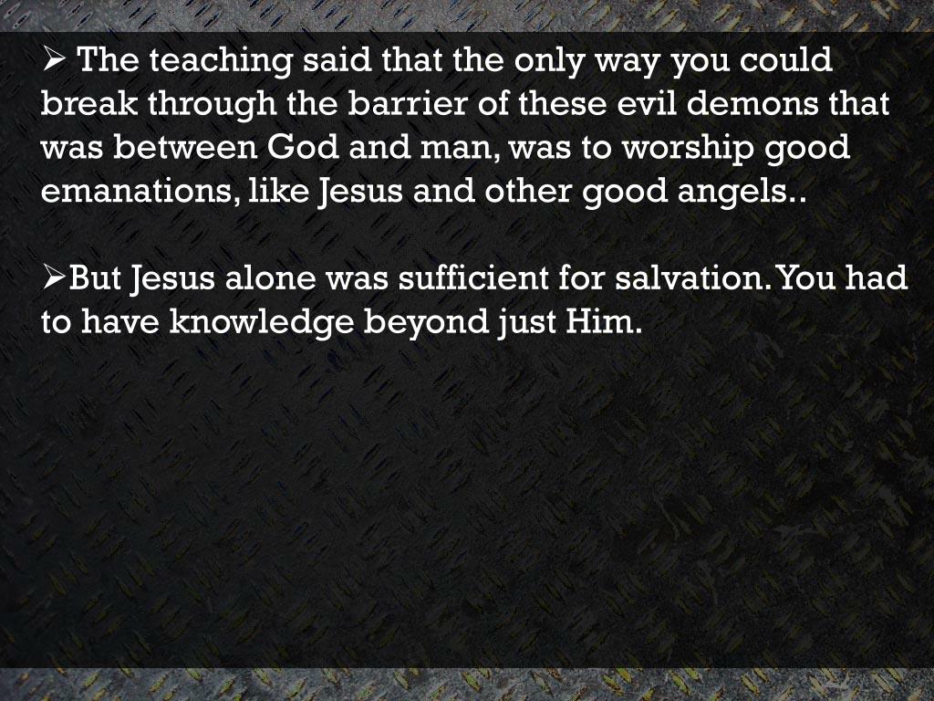 The teaching said that the only way you could break through the barrier of these evil demons that was between God and man, was to worship good emanations, like Jesus and other good angels.. • But Jesus alone was sufficient for salvation. You had to have knowledge beyond just Him.