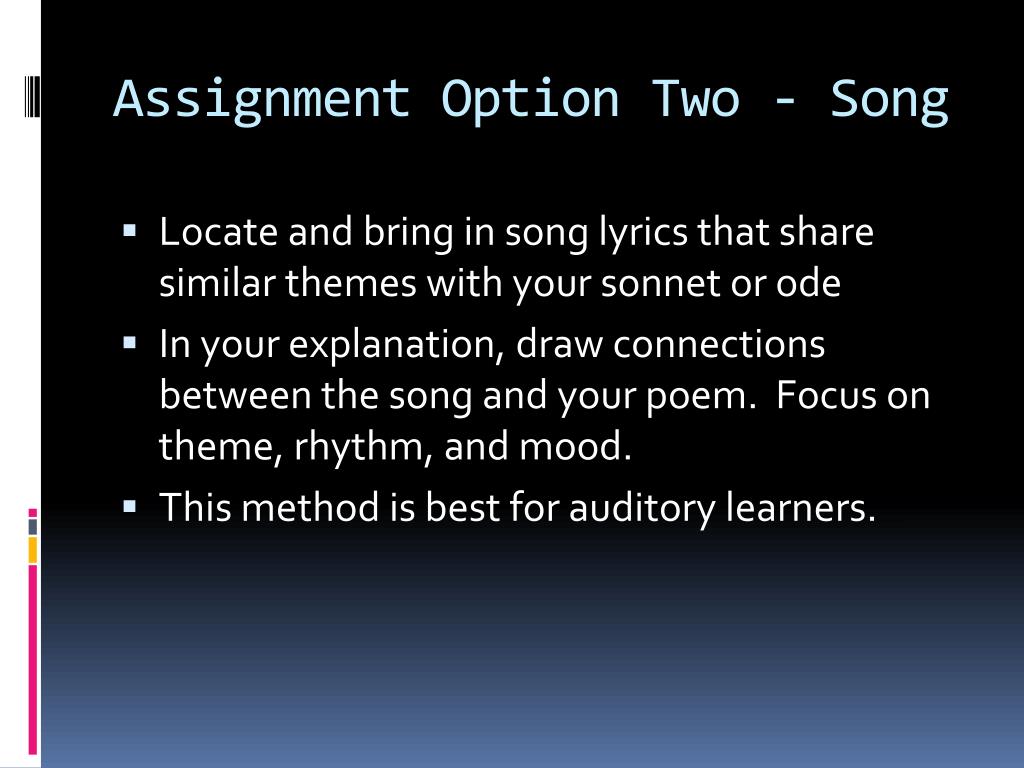 Assignment Option Two - Song • Locate and bring in song lyrics that share similar themes with your sonnet or ode • In your explanation, draw connections between the song and your poem. Focus on theme, rhythm, and mood. • This method is best for auditory learners.