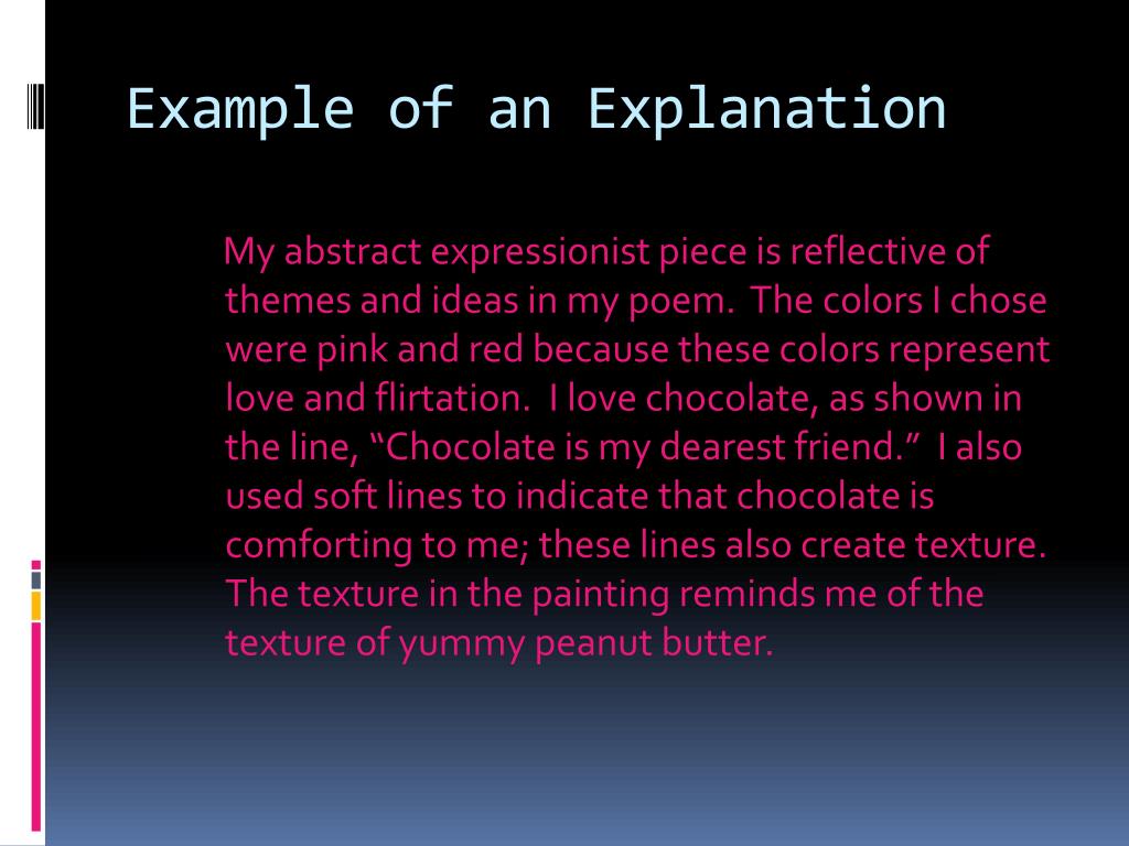 Example of an Explanation My abstract expressionist piece is reflective of themes and ideas in my poem. The colors I chose were pink and red because these colors represent love and flirtation. I love chocolate, as shown in the line, “Chocolate is my dearest friend.” I also used soft lines to indicate that chocolate is comforting to me; these lines also create texture. The texture in the painting reminds me of the texture of yummy peanut butter.