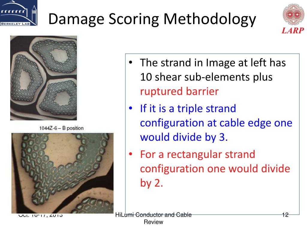 The strand in Image at left has 10 shear sub-elements plus ruptured barrier If it is a triple strand configuration at cable edge one would divide by 3. For a rectangular strand configuration one would divide by 2. Damage Scoring Methodology HiLumi Conductor and Cable Review