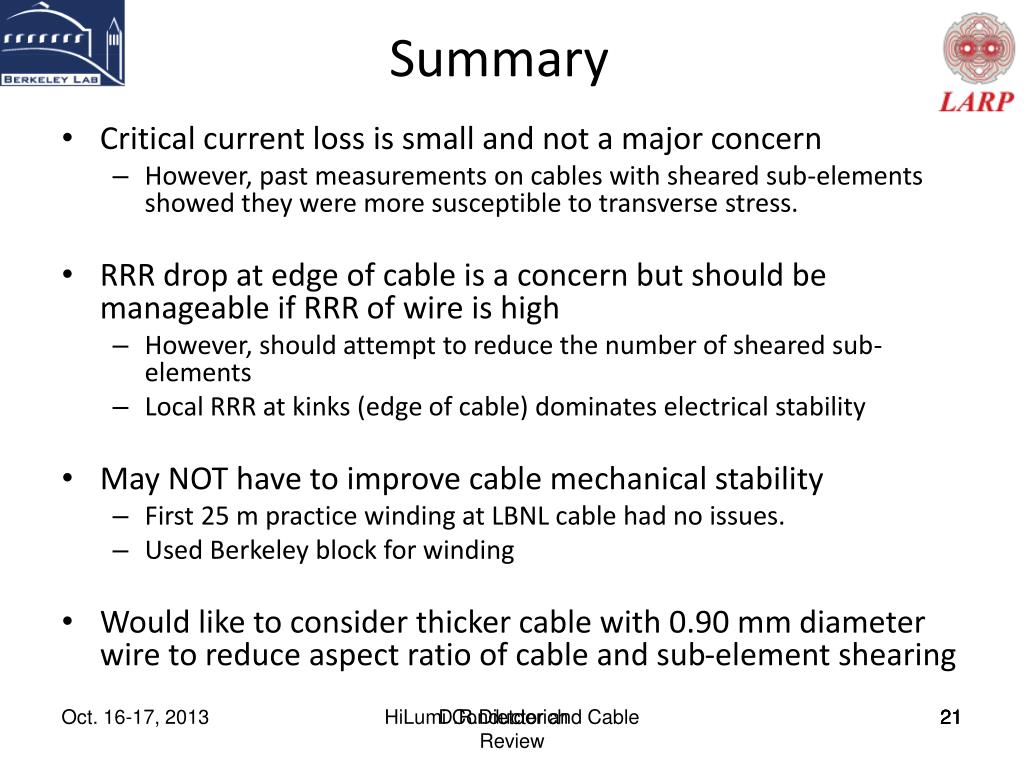 Summary • Critical current loss is small and not a major concern • However, past measurements on cables with sheared sub-elements showed they were more susceptible to transverse stress. • RRR drop at edge of cable is a concern but should be manageable if RRR of wire is high • However, should attempt to reduce the number of sheared sub-elements • Local RRR at kinks (edge of cable) dominates electrical stability • May NOT have to improve cable mechanical stability • First 25 m practice winding at LBNL cable had no issues. • Used Berkeley block for winding • Would like to consider thicker cable with 0.90 mm diameter wire to reduce aspect ratio of cable and sub-element shearing D.R.Dietderich HiLumi Conductor and Cable Review 21 21 21