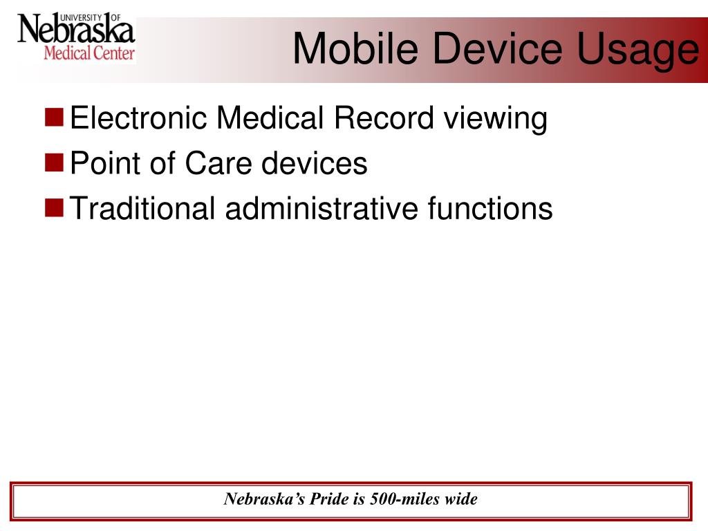Mobile Device Usage Electronic Medical Record viewing Point of Care devices Traditional administrative functions Nebraska’s Pride is 500-miles wide