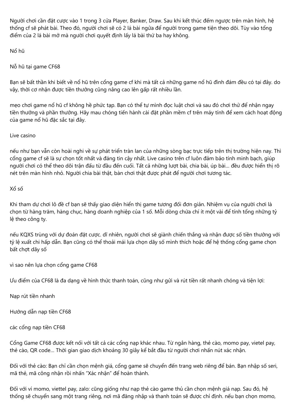 Người chơi cần đặt cược vào 1 trong 3 cửa Player, Banker, Draw. Sau khi kết thúc đếm ngược trên màn hình, hệ thống cf sẽ phát bài. Theo đó, người chơi sẽ có 2 lá bài ngửa để người trong game tiện theo dõi. Tùy vào tổng điểm của 2 lá bài mở mà người chơi quyết định lấy lá bài thứ ba hay không. Nổ hũ Nỗ hũ tại game CF68 Bạn sẽ bất thần khi biết về nổ hũ trên cổng game cf khi mà tất cả những game nổ hũ đình đám đều có tại đây. do vậy, thời cơ nhận được tiền thưởng cũng nâng cao lên gấp rất nhiều lần. mẹo chơi game nổ hũ cf không hề phức tạp. Bạn có thể tự mình đọc luật chơi và sau đó chơi thử để nhận ngay tiền thưởng và phần thưởng. Hãy mau chóng tiến hành cài đặt phần mềm cf trên máy tính để xem cách hoạt động của game nổ hũ đặc sắc tại đây. Live casino nếu như bạn vẫn còn hoài nghi về sự phát triển tràn lan của những sòng bạc trực tiếp trên thị trường hiện nay. Thì cổng game cf sẽ là sự chọn tốt nhất và đáng tin cậy nhất. Live casino trên cf luôn đảm bảo tính minh bạch, giúp người chơi có thể theo dõi trận đấu từ đầu đến cuối. Tất cả những lượt bài, chia bài, úp bài… đều được hiển thị rõ nét trên màn hình nhỏ. Người chia bài thật, bàn chơi thật được phát để người chơi tương tác. Xổ số Khi tham dự chơi lô đề cf bạn sẽ thấy giao diện hiển thị game tương đối đơn giản. Nhiệm vụ của người chơi là chọn từ hàng trăm, hàng chục, hàng doanh nghiệp của 1 số. Mỗi dòng chứa chí ít một vài để tính tổng những tỷ lệ theo công ty. nếu KQXS trùng với dự đoán đặt cược. dĩ nhiên, người chơi sẽ giành chiến thắng và nhận được số tiền thưởng với tỷ lệ xuất chi hấp dẫn. Bạn cũng có thể thoải mái lựa chọn dãy số mình thích hoặc để hệ thống cổng game chọn bất chợt dãy số vì sao nên lựa chọn cổng game CF68 Ưu điểm của CF68 là đa dạng về hình thức thanh toán, cũng như gửi và rút tiền rất nhanh chóng và tiện lợi: Nạp rút tiền nhanh Hướng dẫn nạp tiền CF68 các cổng nạp tiền CF68 Cổng Game CF68 được kết nối với tất cả các cổng nạp khác nhau. Từ ngân hàng, thẻ cào, momo pay, vietel pay, thẻ cào, QR code… Thời gian giao dịch khoảng 30 giây kể bắt đầu từ người chơi nhấn nút xác nhận. Đối với thẻ cào: Bạn chỉ cần chọn mệnh giá, cổng game sẽ chuyển đến trang web riêng để bán. Bạn nhập số seri, mã thẻ, mã công nhận rồi nhấn “Xác nhận” để hoàn thành. Đối với ví momo, viettel pay, zalo: cũng giống như nạp thẻ cào game thủ cần chọn mệnh giá nạp. Sau đó, hệ thống sẽ chuyển sang một trang riêng, nơi mã đăng nhập và thanh toán sẽ được chỉ định. nếu bạn chọn momo,