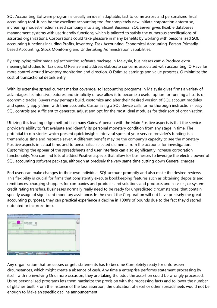 SQL Accounting Software is easy to learn, flexible and highly customizable accounting tool. It's the perfect small business bookkeeping software solution for new small start-up company, raising small to medium size company into a big organization. SQL Accounting is the business accounting solution. With SQL, your database becomes a potent business tool capable of handling an assortment of workloads.<br><br>You might find that there are a variety of benefits to using a sql server for the small business accounting program needs. Having a well designed and properly working SQL database, your applicatio