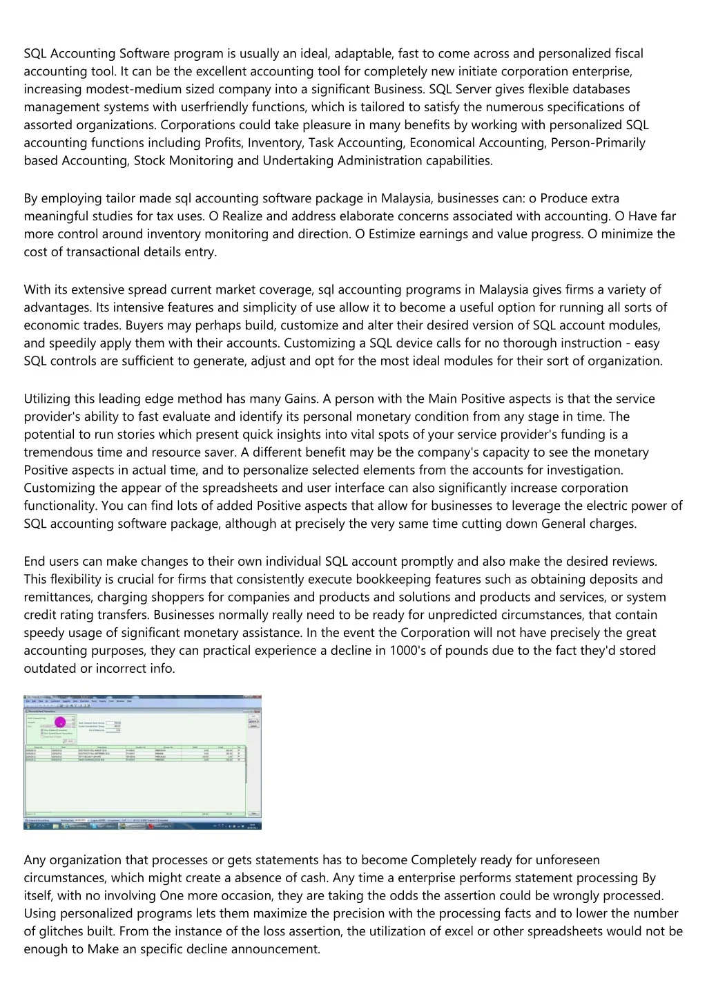 SQL Accounting Software program is usually an ideal, adaptable, fast to come across and personalized fiscal accounting tool. It can be the excellent accounting tool for completely new initiate corporation enterprise, increasing modest-medium sized company into a significant Business. SQL Server gives flexible databases management systems with userfriendly functions, which is tailored to satisfy the numerous specifications of assorted organizations. Corporations could take pleasure in many benefits by working with personalized SQL accounting functions including Profits, Inventory, Task Accounting, Economical Accounting, Person-Primarily based Accounting, Stock Monitoring and Undertaking Administration capabilities. By employing tailor made sql accounting software package in Malaysia, businesses can: o Produce extra meaningful studies for tax uses. O Realize and address elaborate concerns associated with accounting. O Have far more control around inventory monitoring and direction. O Estimize earnings and value progress. O minimize the cost of transactional details entry. With its extensive spread current market coverage, sql accounting programs in Malaysia gives firms a variety of advantages. Its intensive features and simplicity of use allow it to become a useful option for running all sorts of economic trades. Buyers may perhaps build, customize and alter their desired version of SQL account modules, and speedily apply them with their accounts. Customizing a SQL device calls for no thorough instruction - easy SQL controls are sufficient to generate, adjust and opt for the most ideal modules for their sort of organization. Utilizing this leading edge method has many Gains. A person with the Main Positive aspects is that the service provider's ability to fast evaluate and identify its personal monetary condition from any stage in time. The potential to run stories which present quick insights into vital spots of your service provider's funding is a tremendous time and resource saver. A different benefit may be the company's capacity to see the monetary Positive aspects in actual time, and to personalize selected elements from the accounts for investigation. Customizing the appear of the spreadsheets and user interface can also significantly increase corporation functionality. You can find lots of added Positive aspects that allow for businesses to leverage the electric power of SQL accounting software package, although at precisely the very same time cutting down General charges. End users can make changes to their own individual SQL account promptly and also make the desired reviews. This flexibility is crucial for firms that consistently execute bookkeeping features such as obtaining deposits and remittances, charging shoppers for companies and products and solutions and products and services, or system credit rating transfers. Businesses normally really need to be ready for unpredicted circumstances, that contain speedy usage of significant monetary assistance. In the event the Corporation will not have precisely the great accounting purposes, they can practical experience a decline in 1000's of pounds due to the fact they'd stored outdated or incorrect info. Any organization that processes or gets statements has to become Completely ready for unforeseen circumstances, which might create a absence of cash. Any time a enterprise performs statement processing By itself, with no involving One more occasion, they are taking the odds the assertion could be wrongly processed. Using personalized programs lets them maximize the precision with the processing facts and to lower the number of glitches built. From the instance of the loss assertion, the utilization of excel or other spreadsheets would not be enough to Make an specific decline announcement.