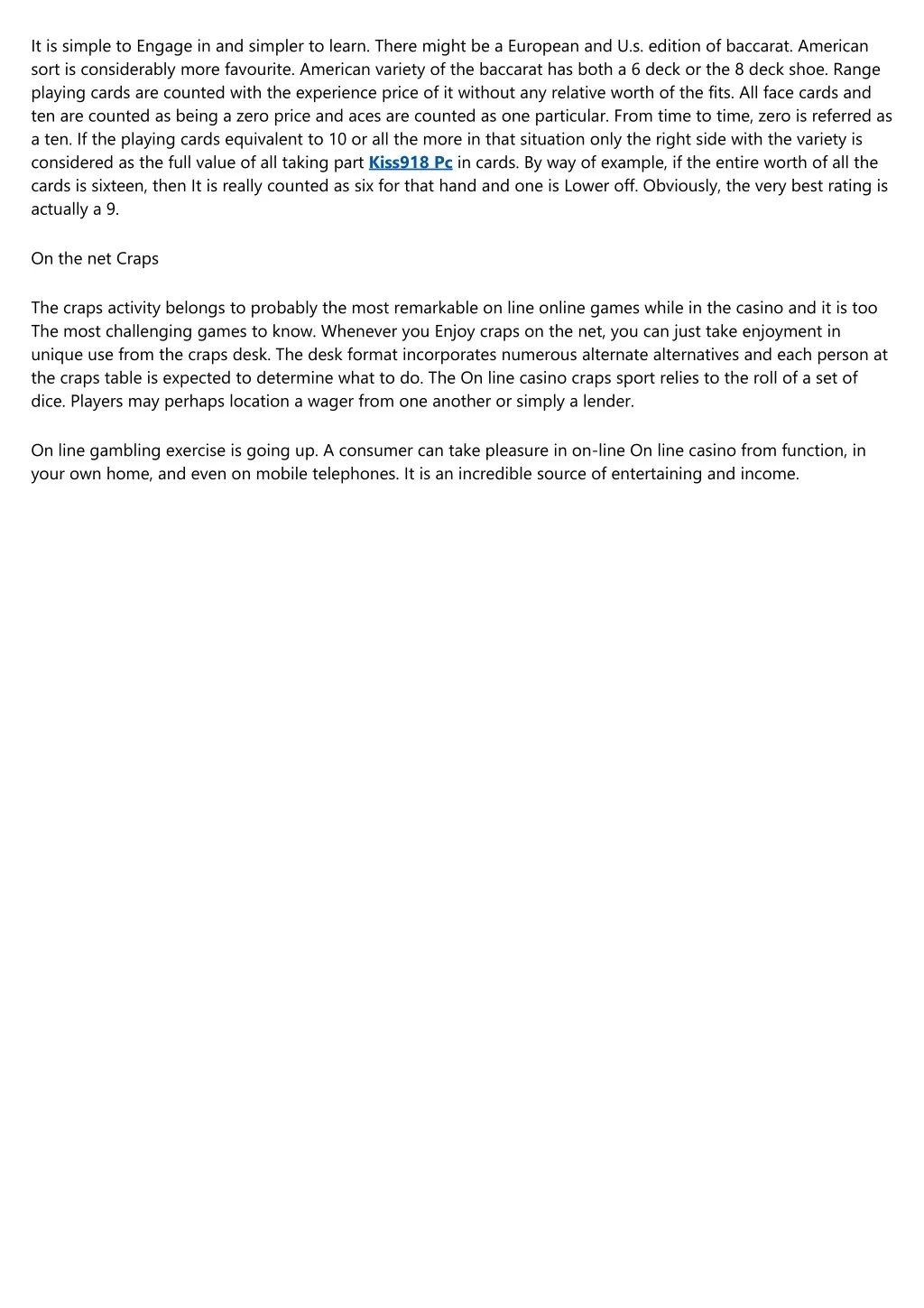 It is simple to Engage in and simpler to learn. There might be a European and U.s. edition of baccarat. American sort is considerably more favourite. American variety of the baccarat has both a 6 deck or the 8 deck shoe. Range playing cards are counted with the experience price of it without any relative worth of the fits. All face cards and ten are counted as being a zero price and aces are counted as one particular. From time to time, zero is referred as a ten. If the playing cards equivalent to 10 or all the more in that situation only the right side with the variety is considered as the full value of all taking part Kiss918 Pc in cards. By way of example, if the entire worth of all the cards is sixteen, then It is really counted as six for that hand and one is Lower off. Obviously, the very best rating is actually a 9. On the net Craps The craps activity belongs to probably the most remarkable on line online games while in the casino and it is too The most challenging games to know. Whenever you Enjoy craps on the net, you can just take enjoyment in unique use from the craps desk. The desk format incorporates numerous alternate alternatives and each person at the craps table is expected to determine what to do. The On line casino craps sport relies to the roll of a set of dice. Players may perhaps location a wager from one another or simply a lender. On line gambling exercise is going up. A consumer can take pleasure in on-line On line casino from function, in your own home, and even on mobile telephones. It is an incredible source of entertaining and income.