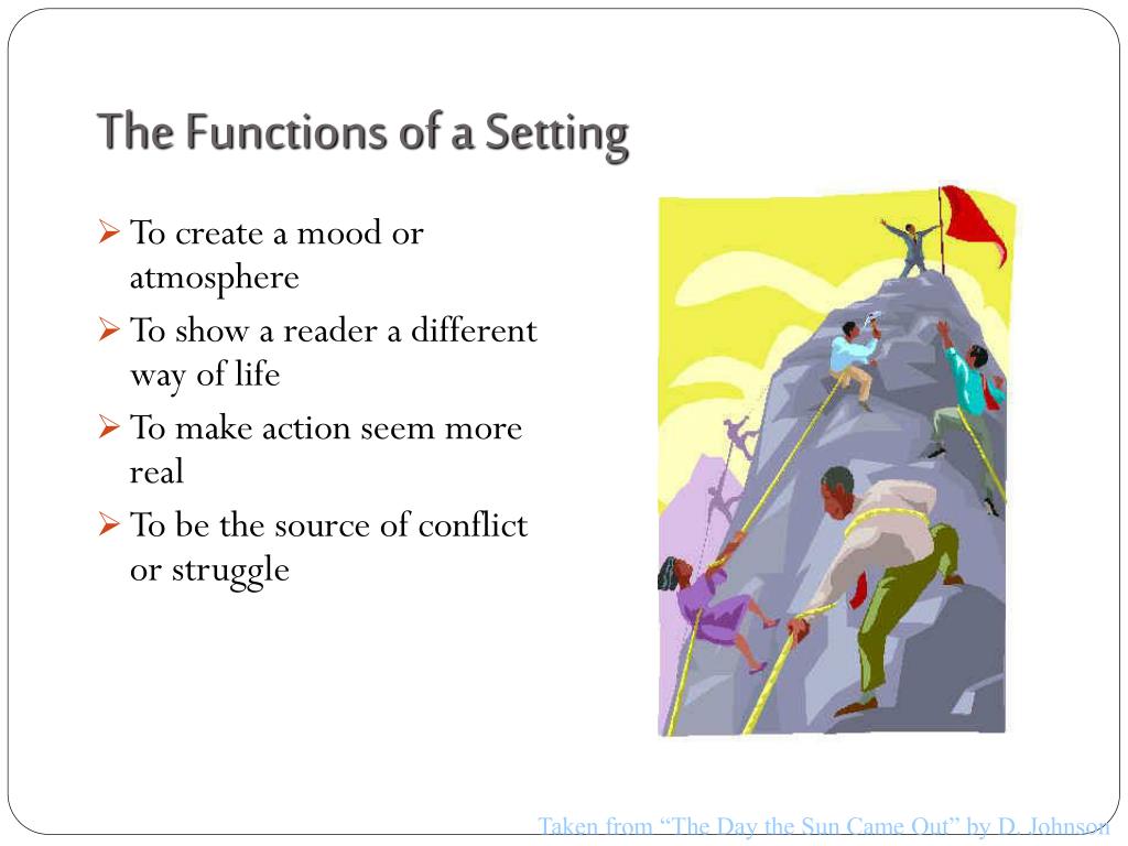 The Functions of a Setting • To create a mood or atmosphere • To show a reader a different way of life • To make action seem more real • To be the source of conflict or struggle Taken from “The Day the Sun Came Out” by D. Johnson