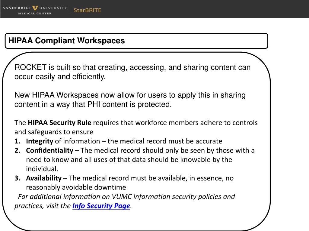 ROCKET is built so that creating, accessing, and sharing content can occur easily and efficiently. New HIPAA Workspaces now allow for users to apply this in sharing content in a way that PHI content is protected. The HIPAA Security Rule requires that workforce members adhere to controls and safeguards to ensure Integrityof information – the medical record must be accurate Confidentiality – The medical record should only be seen by those with a need to know and all uses of that data should be knowable by the individual. Availability – The medical record must be available, in essence, no reasonably avoidable downtime For additional information on VUMC information security policies and practices, visit the Info Security Page.